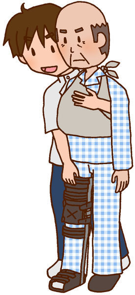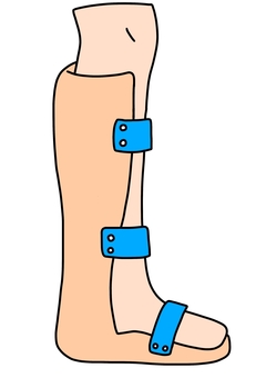 このような障害に対して、AFO(Ankle Foot Orthosisの略です。足関節装具などの短下肢装具のことをいいます:下のイラスト)やKAFO(Knee Ankle Foot Orthosisの略です。膝足装具などの長下肢装具のことをいいます)が用いられ、関節の安定性を高めたり、代償運動を最小限に抑えたりする効果が期待されます。