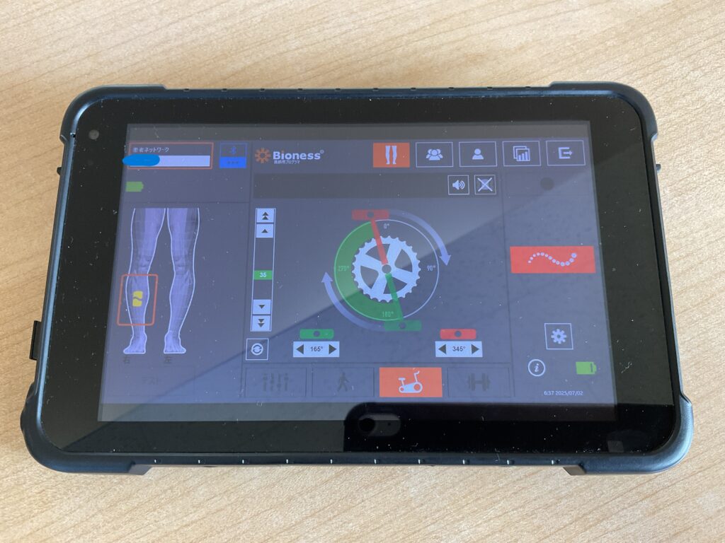 モードが4つあるんですが、そのなかでトレーニングモード(エアロバイク用)を選択、電気刺激は実際に自転車エルゴメーターに乗って漕いでもらう中で、自動でペダルの位置によって電気刺激のon・offが設定されます。
