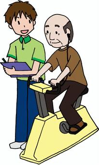 | 左右対称のペダリング技術(下肢協調性低下) | L300Goを併用しての自転車エルゴメーターを駆動する練習(実際に病院で導入している電気刺激機器です) |